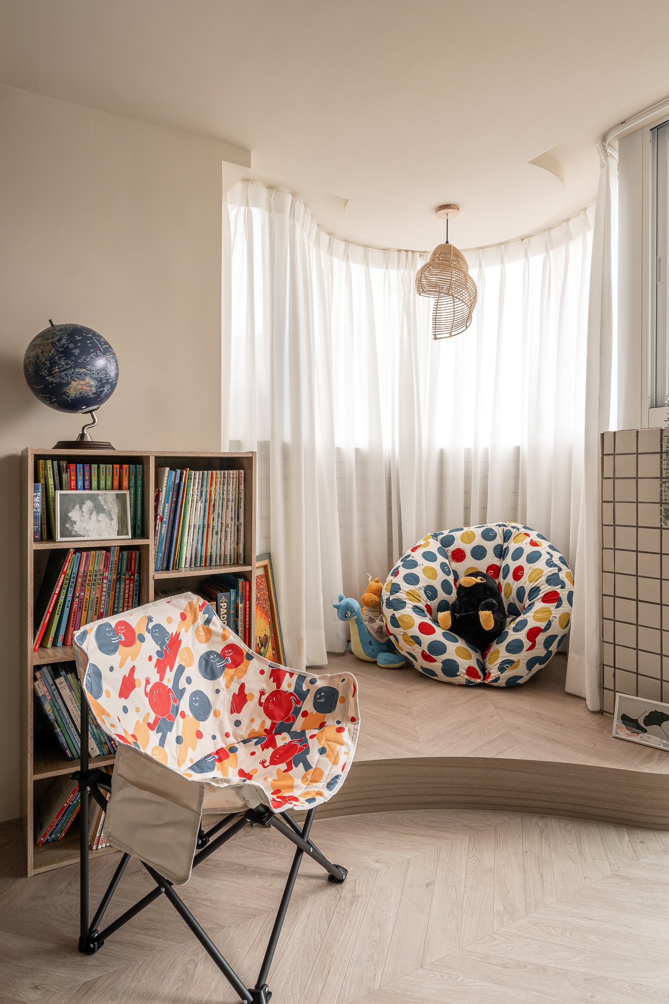 將室內圓弧窗面轉化為情境式生活角落,不只保留採光優勢,更延伸為孩子專屬的休憩與閱讀場域,讓日常陪伴與自我探索自然發生。